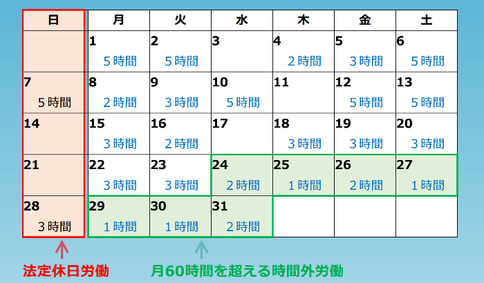 月の時間外労働が上記のように行われた場合、今回の改正労働基準法によって影響が出るのは、24日以降の平日です。