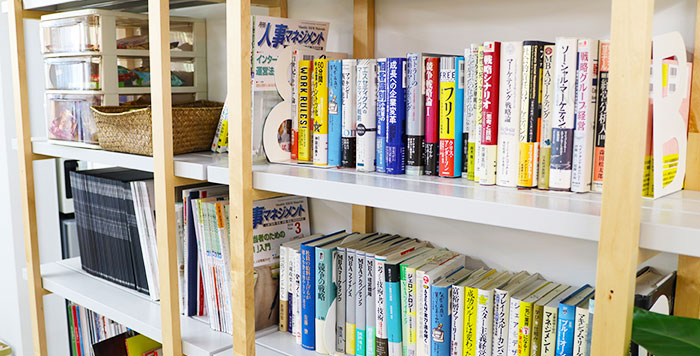 本棚には、経営の参考になる書籍がずらりと並んでいました。利用者はこちらも読み放題です。