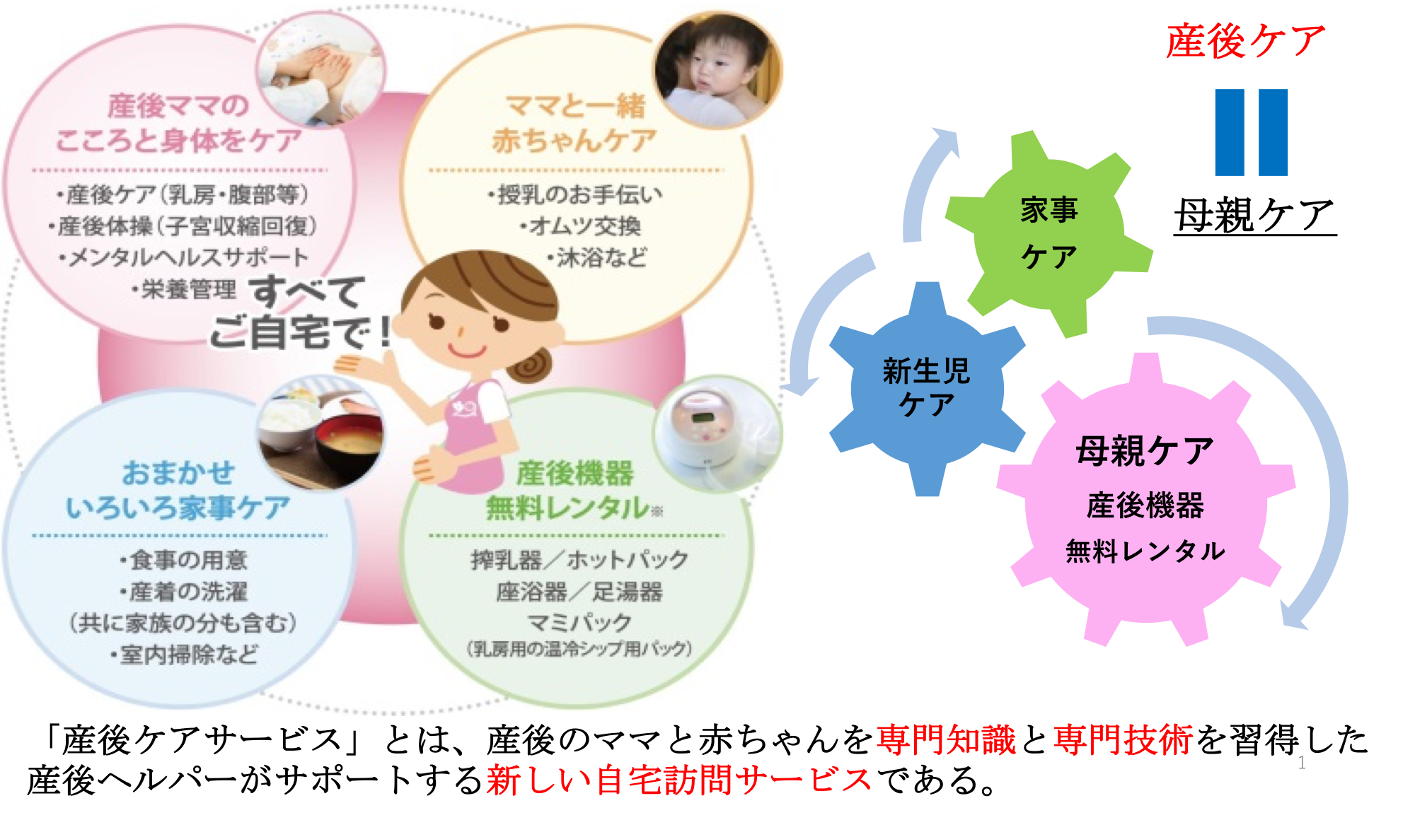 明:日本初の「自宅訪問型産後ケアサービス」です。専任の女性産後ヘルパーが母親と赤ちゃんをサポートする訪問ケアサービスとなります。