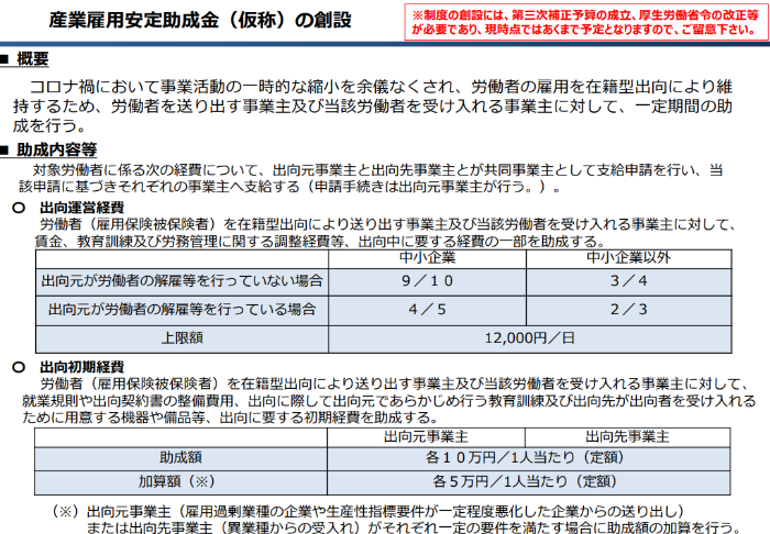 現行の「雇用調整助成金」でも、出向元の事業者に対しての助成はあります。