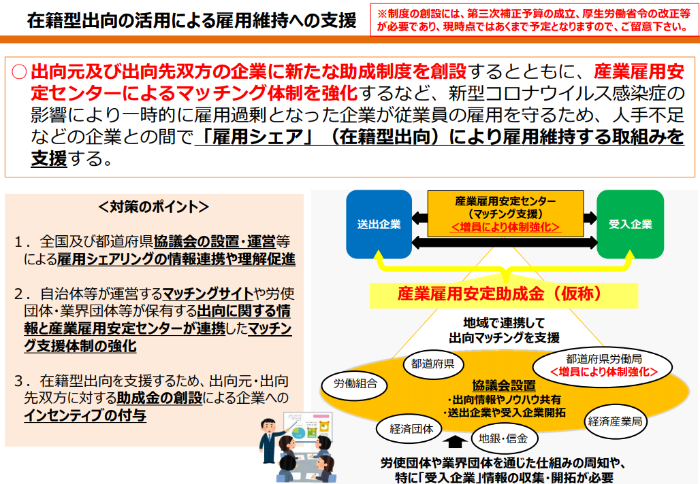 出向先にもインセンティブを与え、雇用調整の手段として出向の活用を拡大させることで、雇用過剰となった会社と人手が足りない会社での「雇用シェア」を促すのが新制度の狙いです。