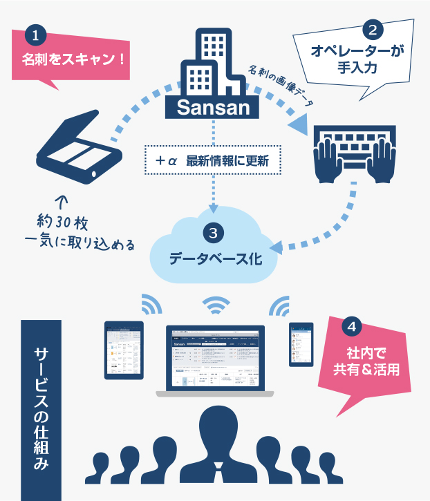 名刺情報の登録はいたって簡単。レンタルした専用スキャナ—で名刺を読み込み、ユーザー名と日付を選択するだけで完了だ。スキャンは1分で30枚分程の名刺を一気に取り込めるので手間なくスピーディー。あとは読み取った名刺の画像データがネット経由でSansanへ送信され、オペレーターの手入力によってクラウド上でデータベース化される。ユーザーはPCやスマホ等のアプリケーションでデータへアクセスし、社内で活用・共有することができる。