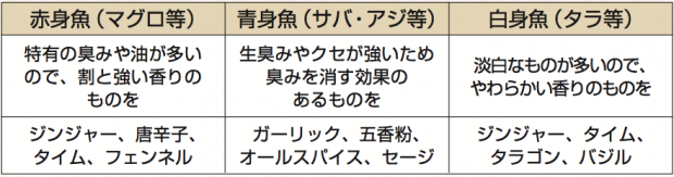 目的に応じてジンジャーや山椒など、下ごしらえに加えるだけで魚の臭みを抑えることができます。洋風にまとめるなら、タイム、フェンネル、ワインを少量用いるのも効果的です。魚の特徴に合わせて使い分けをし、いろいろなスパイスを試してみましょう。