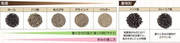 スパイス&ハーブを使いこなすには、その細かな特徴を理解することも大切です。例えばコショウの場合、「粒度(粒の細かさ)」によって、その香りや辛みの印象が大きく変わります。
