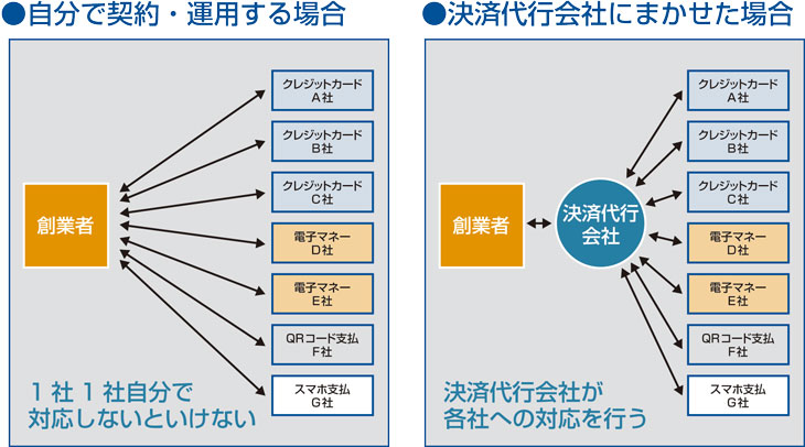 決済代行は、決済サービスの導入にあたって契約から運用まで決済会社との間を取り持ってくれるサービスです。複数の決済サービスを登録する必要が出てきたとき、1社ずつ契約をしていると時間も手間もかります。決済代行を利用すれば、契約・運用のやり取りを全て任せることができるため、「忙しい創業期に、極力手間は減らしたい」という創業者にとって強い味方になるでしょう。