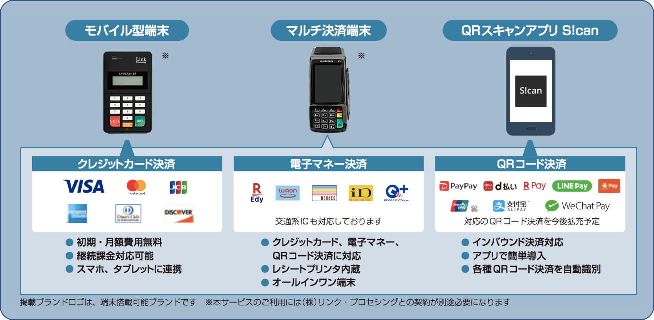 店舗向け決済では、クレジットカード決済の「モバイル端末型」、クレジットカード・電子マネー・QRコード決済に対応した「マルチ決済端末」、QRコード決済が可能なQRスキャンアプリ 「S!can」の3種類を用意。