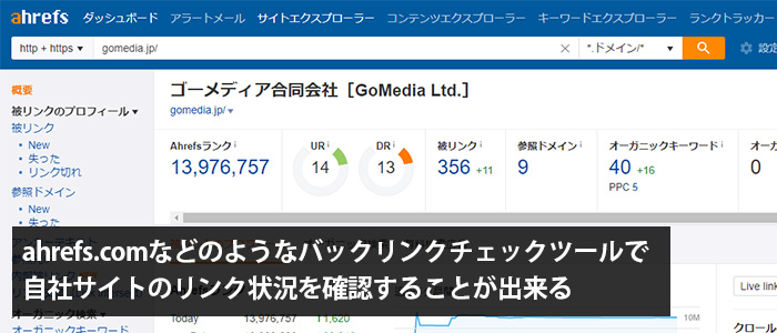 自社や競合サイトのバックリンク状況はAhrefなどのツールで確認できます。