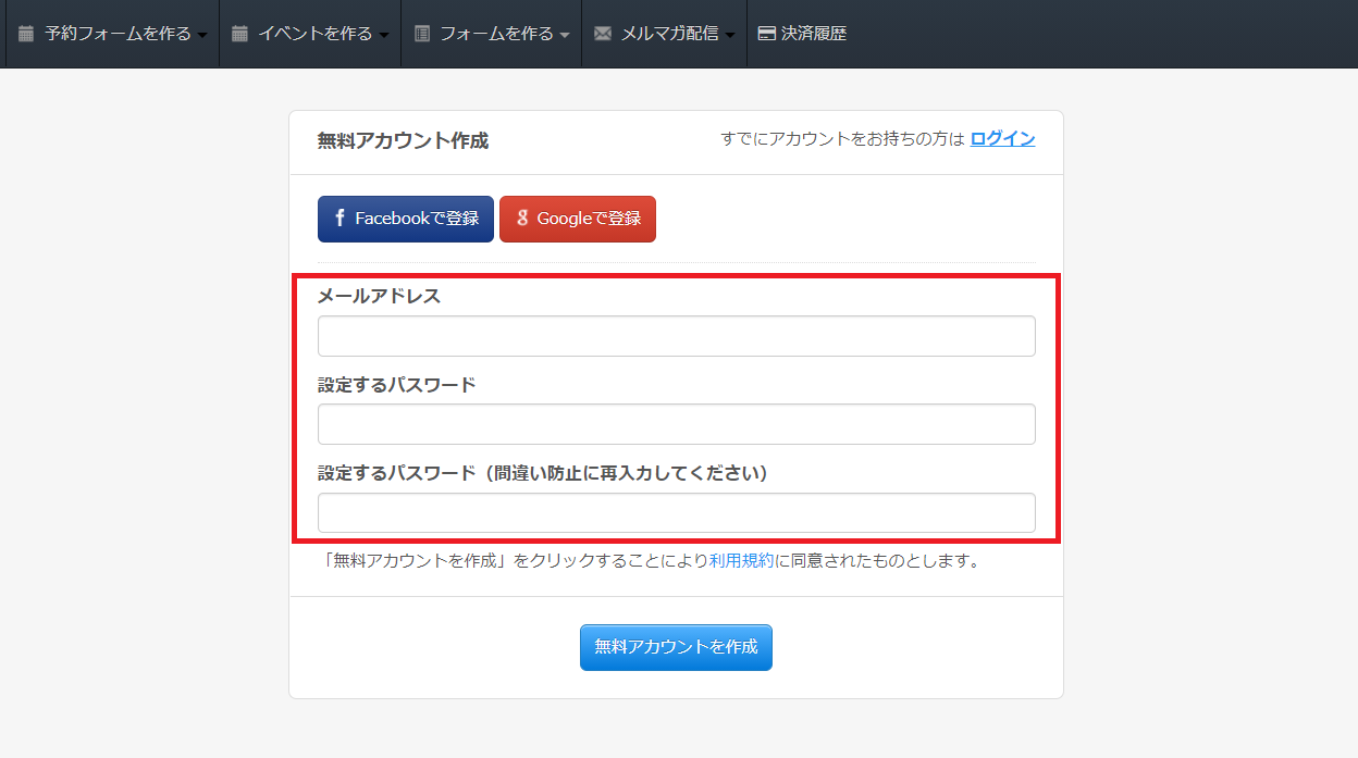 すると、メールアドレスの登録と、パスワードの設定画面に切り替わるため、それぞれ入力します。なお、「Facebook」と「Googleアカウント」からの登録にも対応しています。