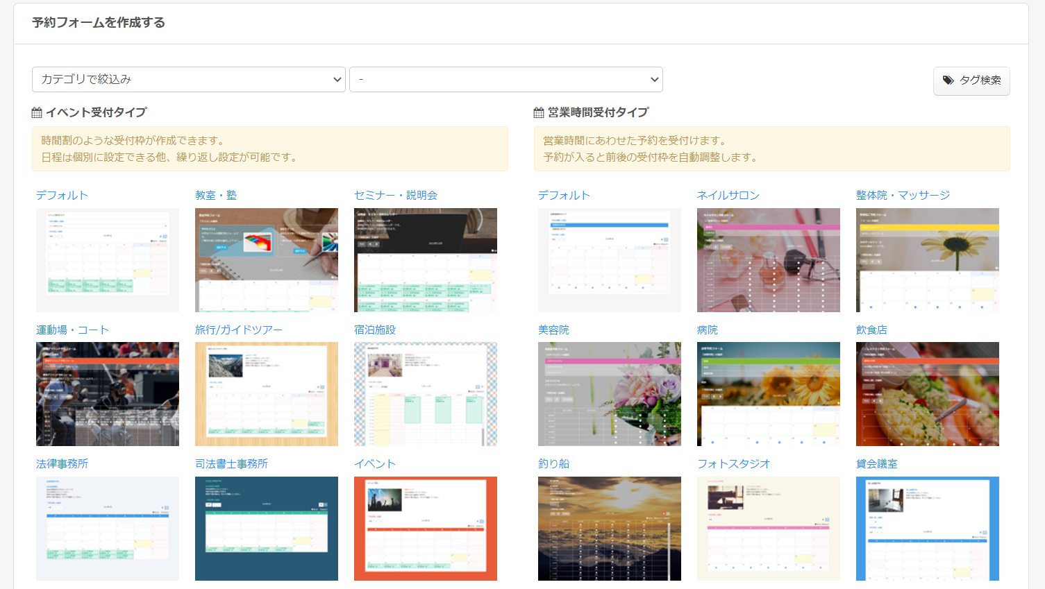 アカウントの作成が完了したら、いよいよ予約フォームの作成に移ります。冒頭でもご紹介した通り、テンプレートが用意されているため、カテゴリから用途に合わせて選択します。