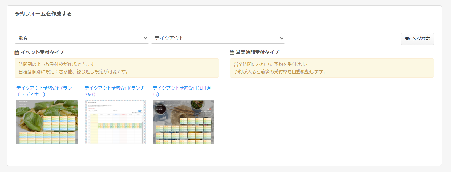 テイクアウト(お持ち帰り)の選ぶと、受付タイプのフォームが用意してありました。営業時間や受付方法に応じて、あらかじめフォームを作りやすいように型が決まっています。