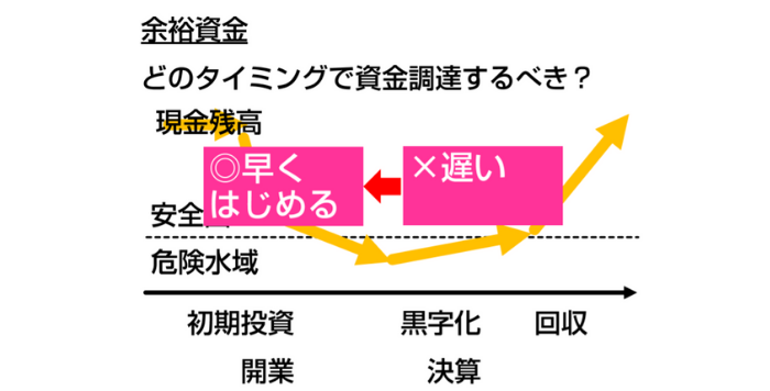 融資のタイミングで注意したいのが、「入金までのタイムラグ」です。起業後、売り上げがあってから入金までには2~3ヶ月かかるケースも多くあります。自己資金がひっ迫してからでは、資金の借り入れが難しくなってしまいます。