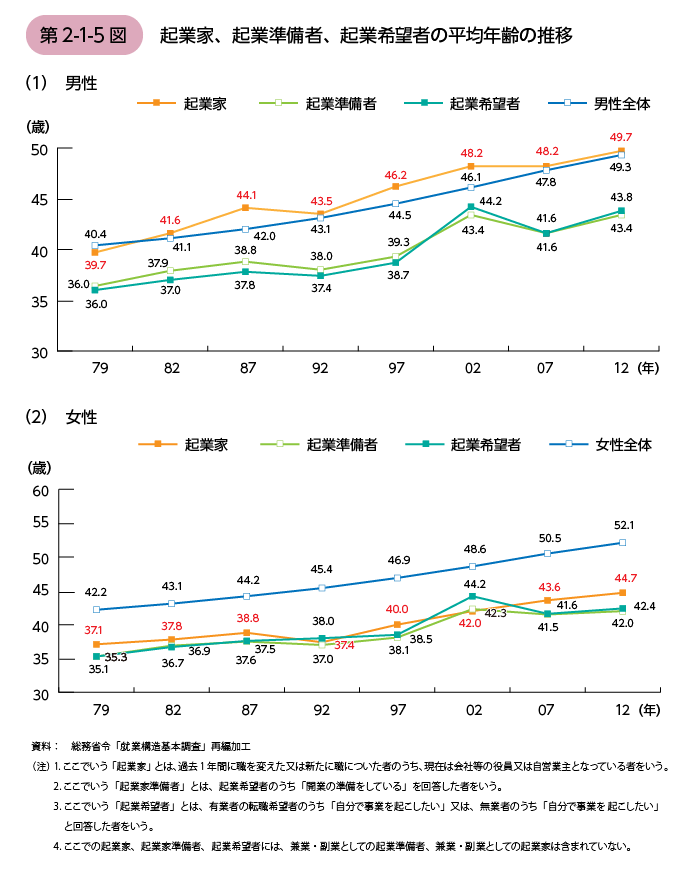 更に、起業家や起業準備者、そして起業希望者の平均年齢も年々高くなっているのです。