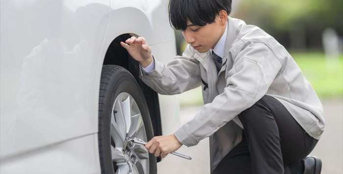 タイヤ・ホイールの検査では、タイヤの空気圧や残り溝の不可さ、変摩耗やひび割れがチェックされます。