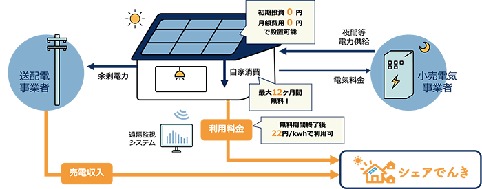 「シェアでんき」とは、初期費用0円で太陽光発電システムを設置し、電気料金が安価になるサービスです。