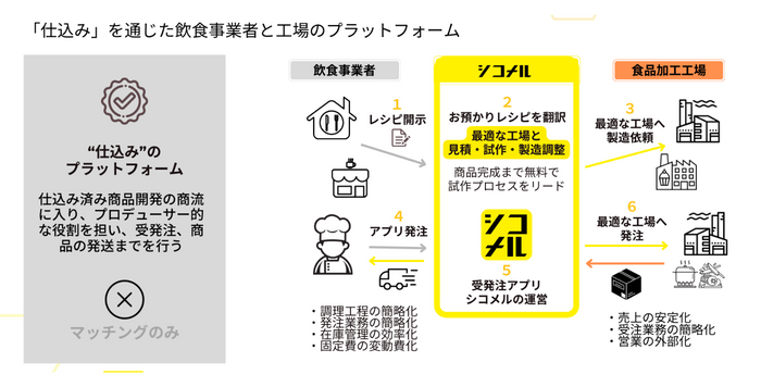 そこで、シコメルは中小の飲食店用に小ロットでも仕込みを請け負うことができる仕組みを考案し、アプリを通じて発注から納品までを一元管理できるサービスを提供することにしました。