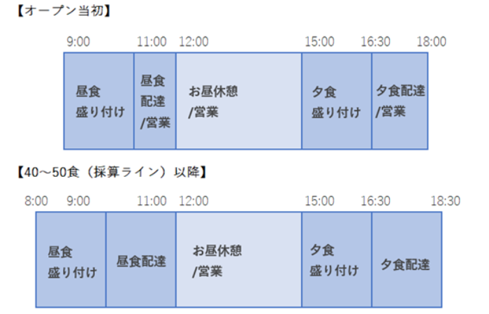 配膳数の少ないオープン当初は日中を中心に営業時間を多く捻出することになります。40-50食まで拡大すると、ひとまずは採算が充分取れる規模になるので、配食をスムーズに進めながら合間の時間でケアマネージャーとの営業活動を進める形になります。