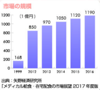 民間の配食サービスの市場規模は近年急成長。1999年には168億円だった市場が2016年には1,200億円に迫る規模となっています。