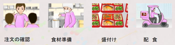 この配食業務を昼食・夕食の二回おこないます。当初は一人でこれら全てのフローを対応するケースが多いですが、ビジネスが順調に拡大すれば、盛り付けや配食それぞれの専門スタッフを雇って、各フローを分担して進める形になります。