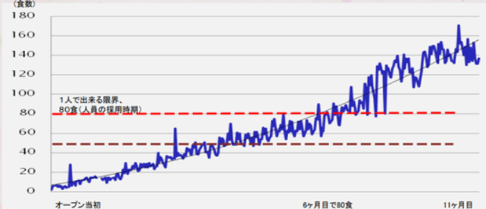 ここまで紹介した強みを背景に、オープン当初から順調に配食数を伸ばし、ビジネス拡大が可能です。こちらは2009年に開業した実例ですが、半年で1人で対応できる最大数の80食に達し、わずか11か月で170食まで拡大に成功しています。