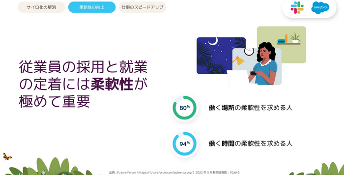Slackが支援するFuture Forumというコンソーシアムの調査で、日本の企業でも顕著になっているのは、4割の人がリモートと出社とのハイブリッドを継続したい、1割の人はフルリモートで働きたい、残りの5割の人が会社に戻って仕事したいということです。