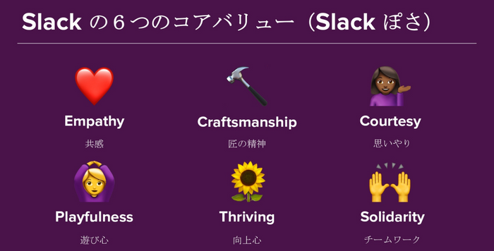佐々木:Slackは創設初期から企業理念として6つのコアバリューと、従業員に求める4つの性質を設定してきました。6つのコアバリューとは共感、匠の精神、思いやり、遊び心、向上心、チームワークで、4つの性質とはスマート(探究心)、ハンブル(謙虚、相手への敬意)、ハードワーキング(プロ意識)、コラボレイティブ(チームワーク)です。
