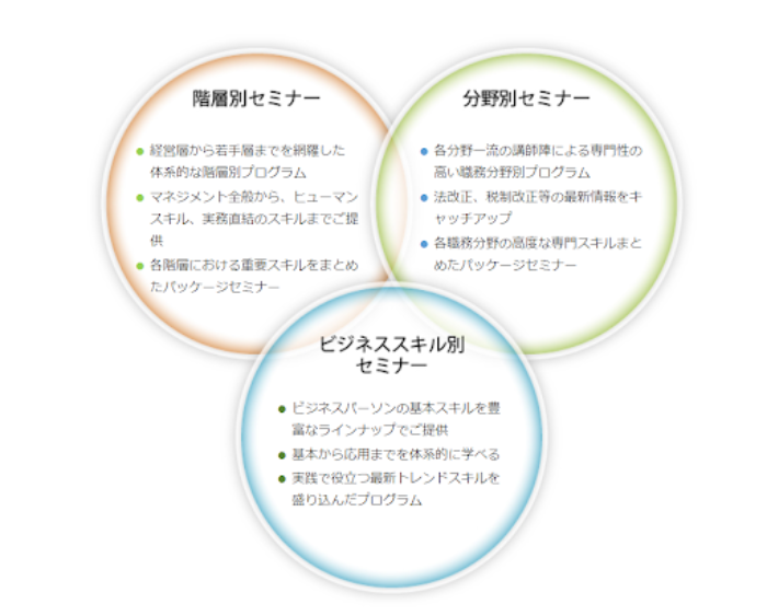 年間1,000件を超えるセミナーを実施していますが、会場が東京・大阪のみである点に気をつけましょう。地方に拠点を置いている企業だと、セミナー受講ごとに両都市に行く必要があります。とはいえ、オンラインセミナーやeラーニング、講師の派遣も行っているため、地方からでもセミナーを受講できます。