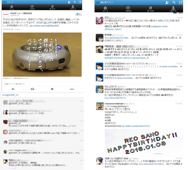 (左:ユニークなツイートで有名なシャープ公式アカウント。右:#(ハッシュタグ)の使用例)