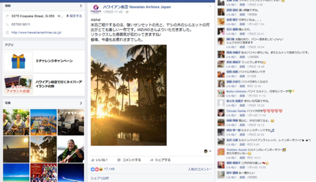 (ハワイアン航空公式Facebookページ。美しい写真にいいね!・シェア・コメントが集まっている様子)