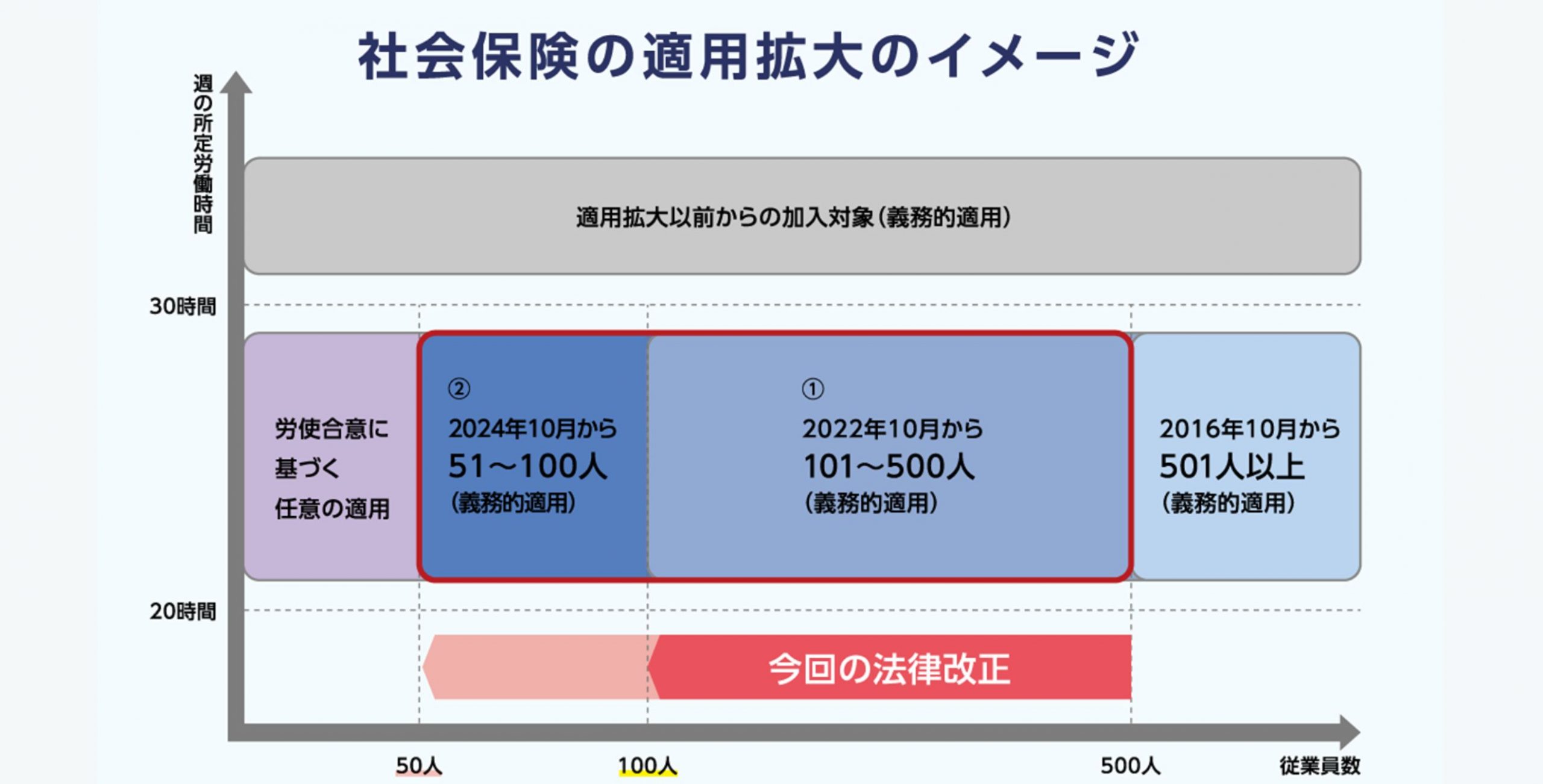 2020年5月29日に成立した「年金制度改正法」により、社会保険の適用拡大が段階的に行われます。2022年10月1日の適用拡大では、従業員数101人以上の企業が、短時間労働者を社会保険に加入させる義務を負うことになりました。