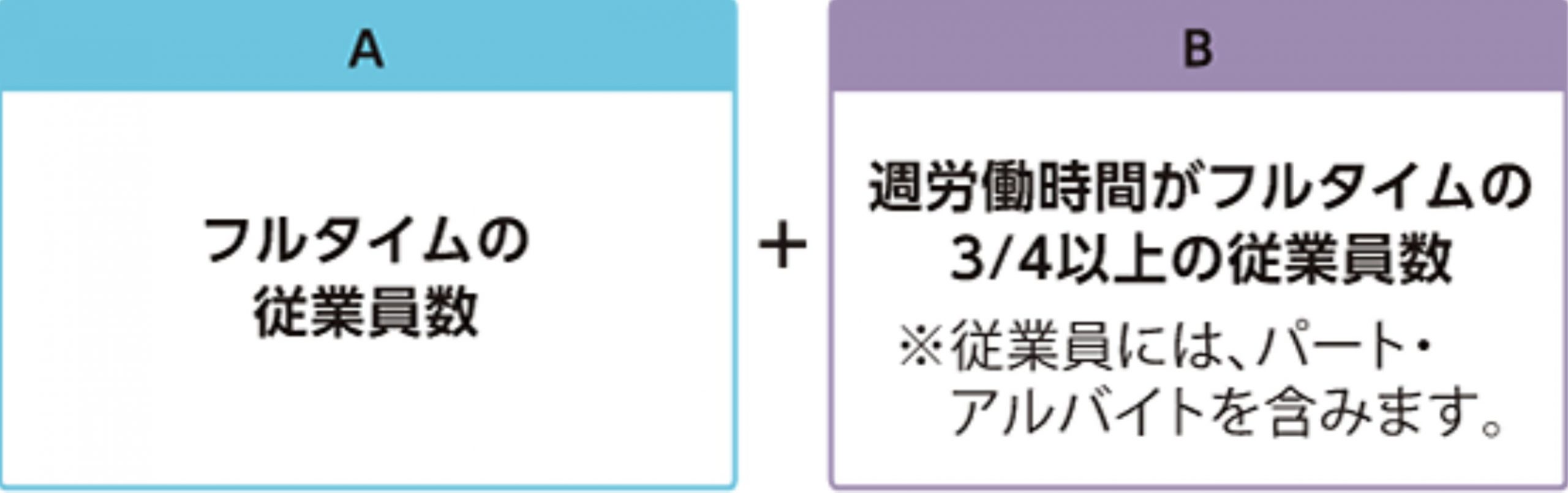 従業員数は、上記A+Bの合計でカウントします。Bは、週労働時間および月労働時間が、フルタイムの3/4以上の従業員数(パート・アルバイトを含む)です。