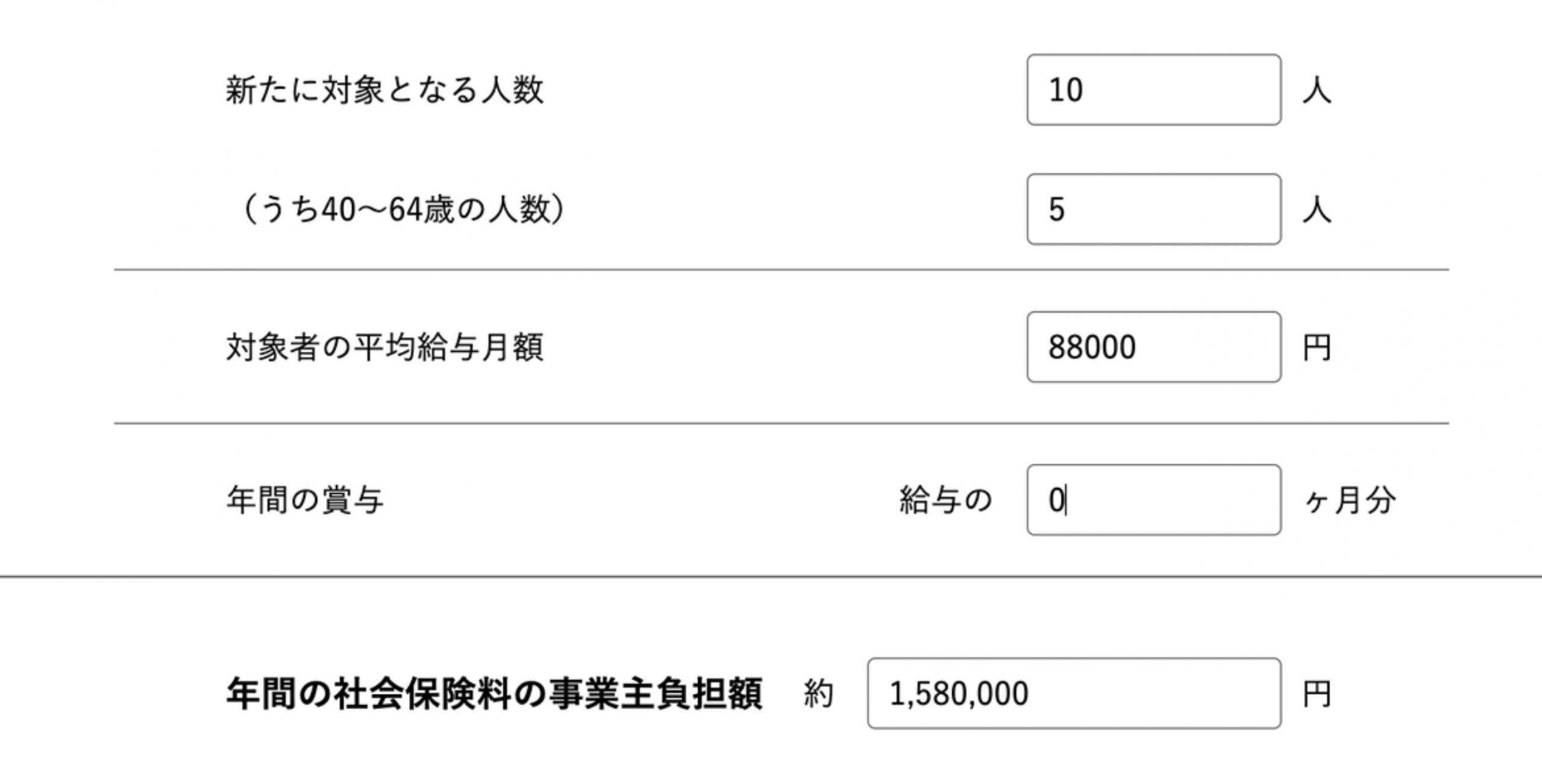 上記の通り、加入対象者が10人(うち5人が40〜64歳)、平均給与月額88,000円・賞与なしの場合、年間で約158万円の社会保険料を新たに会社が負担することになります。