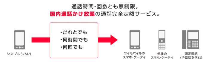 通話時間、回数関係なく、国内通話がかけ放題になります。シンプル2Lなら月額料金1,000円で加入できます。