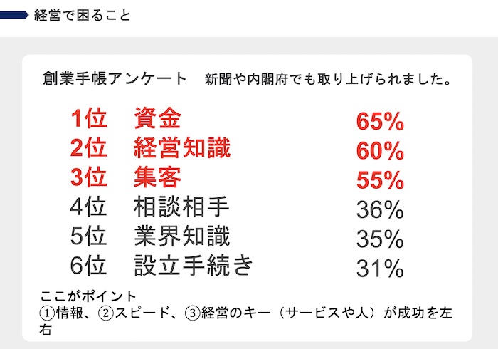 創業手帳の会員に対して、「経営で困ること」と題したアンケートを実施しました。アンケート結果は上図の通りです。1位は資金、2位が経営知識、3位が集客です。この結果を見れば、もしあなたの会社が起業家の経営知識や集客を補うような情報や商品を提供できれば、起業家にも喜んでもらえることがわかります。