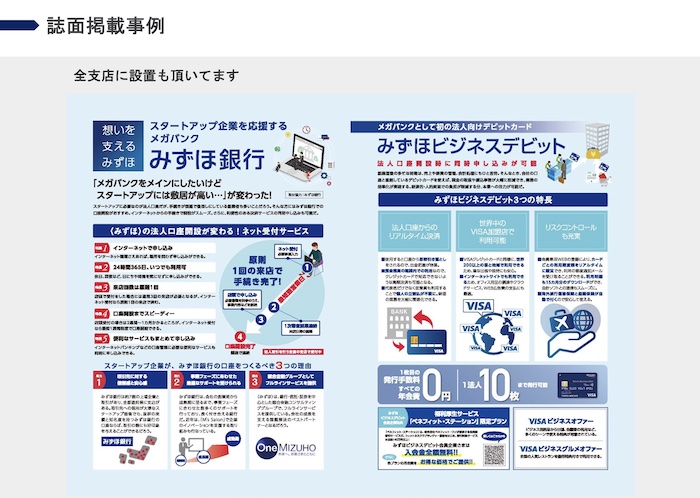 創業手帳の冊子を全支店に置いていただいているみずほ銀行の事例です。みずほ銀行では、創業手帳の文脈にあわせ、スタートアップ向けに商品を訴求するスタイルの誌面広告になっています。