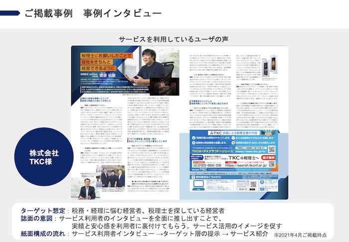 商品を訴求するのではなく、商品の利用者インタビューを載せる形式の紹介ページも制作できます。株式会社TKCの広告では、税務・経理に悩む起業家・経営者向けに実際に利用した利用者の声を載せることで訴求しています。