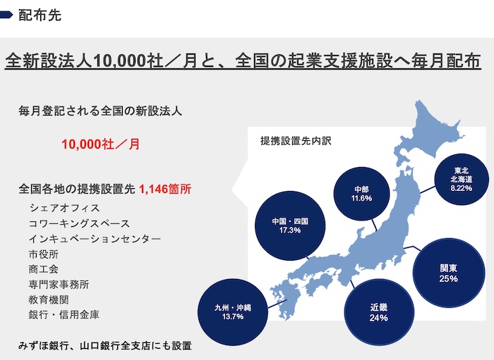 創業手帳は毎月設立された新設法人の経営者の手元に届きます。実はそれ以外にも、多くの創業支援の提携機関で創業手帳は配布されています。シェアオフィスやコワーキングスペース、市役所や教育機関、銀行など。必ず起業家・経営者が立ち寄るような場所に設置しています。みずほ銀行、山口銀行には全支店置いていただいています。