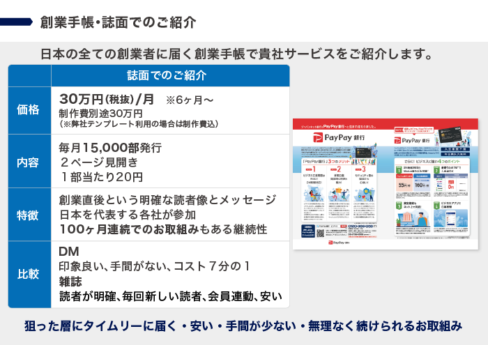 「誌面でのご紹介」は、毎月15,000部、法人を設立した起業家に届く創業手帳の冊子誌面見開き2ページに商品の紹介ページを載せるお取組みです。1ヶ月30万円(税抜き)〜、1部あたり20円という安さで着実に起業家にアプローチできます。弊社創業以来ずっと継続して掲載しているお客さまもいらっしゃる継続性の高いお取り組みです。。