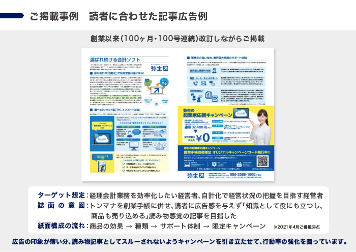 例えば、創業以来ずっと8年間、継続してお取組みをいただいている弥生株式会社の広告は、経理業務の効率化に役立つ情報を載せつつ、商品も紹介するスタイルを取っています。読み物として役に立つ形式を取ることで、読者もスルーせずしっかりと読んでくれるはずです。