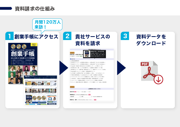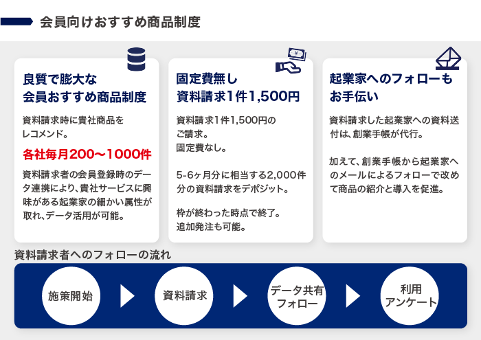 「会員おすすめ商品制度」では、各社毎月200件〜1,000件ほどの資料請求数獲得を達成されています。平均では、毎月300件〜400件です。固定費なしで、資料請求1件あたり数千円という安さで、創業手帳会員に対して訴求できます。資料請求した起業家への資料送付は創業手帳で代行し、その後もステップメールで貴社商品をご紹介するお手伝いをさせていただくことも可能です。