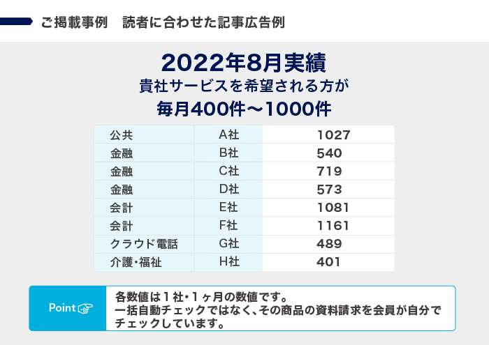 2022年8月の実績は、以上のようになっています。多いところでは1ヶ月1,000件以上の資料請求を達成されています。
