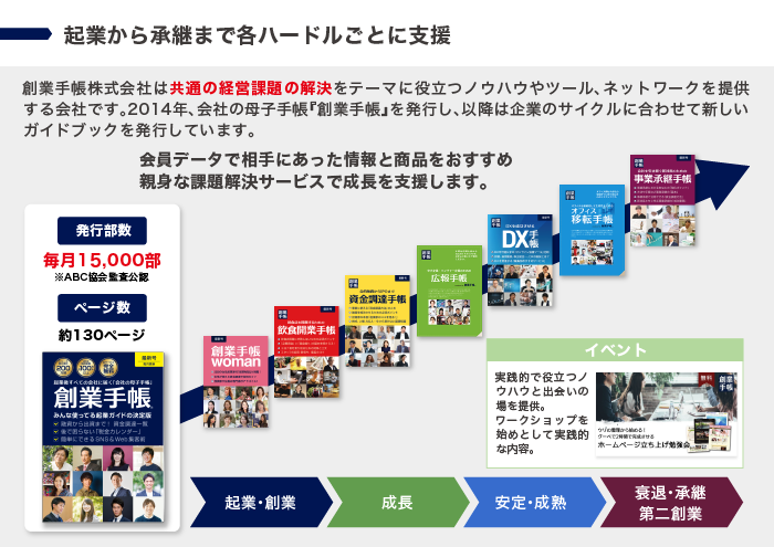 資金調達のやり方に特化して解説する『資金調達手帳』や、飲食開業情報に特化した『飲食開業手帳』、女性起業家を応援する『創業手帳 WOMAN』や広報のノウハウをまとめた『広報手帳』、リモートワークやDXのノウハウを詰め込んだ『リモートワーク手帳』、事業承継に役立つ『事業承継手帳』、オフィス移転後の法人に届く『オフィス移転手帳』。起業家・経営者を多様な観点からサポートすべく、続々とガイドブックを増やしています。