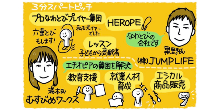 中長期ビジョンとして将来的には、なわとびをオリンピック種目にしたいという黒野氏。また、幼稚園児から高齢者という個人の枠だけでなく、企業や地域、家族などの組織、さらには世界まで、1本の縄ですべての人とつながる社会をつくるために事業を進めていきたいそうです。