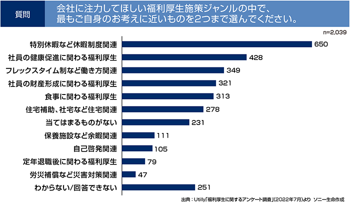 Utillyのアンケートによると、従業員が注力を希望する福利厚生のジャンルは次のとおりです。