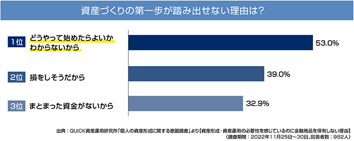 将来の資産形成に悩む背景には「どうやって始めたらよいかわからない」ことがあります。第一歩を踏み出せないがゆえに、将来への不安も解消できない方が多いのです。