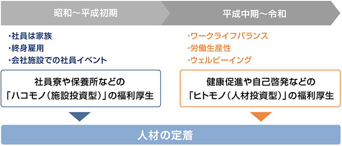 平成中期以降は、個々人の生活の質にフォーカスが当てられて、ワークライフバランスの改善やモチベーションアップ、ウェルビーイングの促進などが重視されるようになりました。たとえば、働き方改革とともに普及しつつあるフレックスタイムやノー残業デーの設置、資格取得や自己啓発プログラムに対する補助・支援などがみられます。「ハコモノ」重視の福利厚生から「ヒトモノ」重視へ変わりつつあるのです。