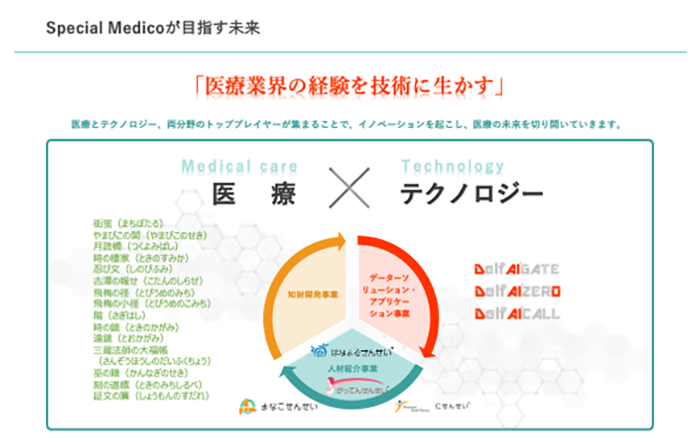 医師・産業医の紹介については「すべての医師にSpecial Medicoのオンデマンドサービスを」をコンセプトに、特許技術を搭載したオリジナルシステムを構築し、すべてのドクターに価値のある情報を迅速かつきめ細やかにお届けするとともに、健診現場や企業とのマッチングサービスを提供していることが特長です。