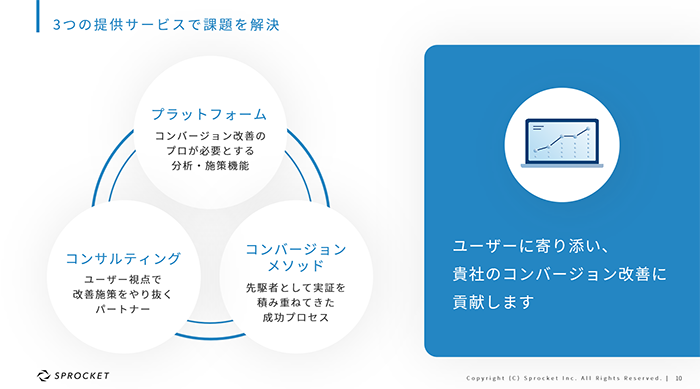 コンバージョンを最適化するプラットフォーム「Sprocket」の開発・販売・運用と、長年の実践データから培われたメソッドを用いたコンサルティングを展開しています。