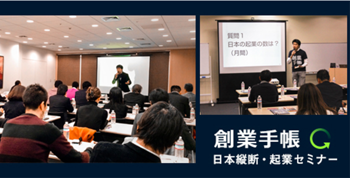 起業家向けのビジネス情報誌「創業手帳」を250万部発行する傍ら、創業者向けの具体的な事例やノウハウを創業手帳セミナーで伝えています。参加費は無料にもかかわらずクオリティが高いと評判で、ほとんどのセミナーが満員御礼になる人気です。