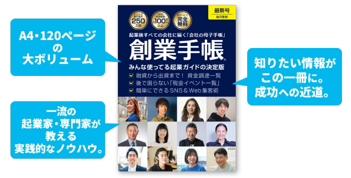創業手帳は、起業の成功率を上げる経営ガイドブックとして、毎月アップデートをし、今知っておいてほしい情報を起業家・経営者の方々にお届けしています。無料でお取り寄せ可能です。