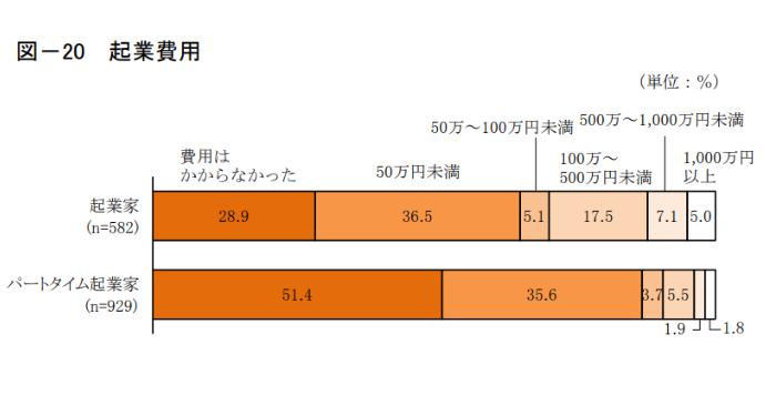 また、企業資金が50万円未満の割合は、起業家では約37%、パートタイム起業家では36%と、起業費用を低めに抑えるケースが多いです。